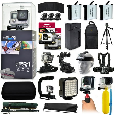 In the box:- GoPro HERO4 Black- Rechargeable Battery for HERO4- Standard Housing- Skeleton Backdoor- Curved Adhesive Mount- Flat Adhesive Mount- Quick Release Buckle- 3-Way Pivot Arm- USB Cable47th Street Photo Accessories:- 32GB Transcend Class 10 microSD Card (633x) - 64GB Transcend Class 10 microSD Card (633x) - Replacement Li-ion Battery Pack for GoPro (3) - Replacement AC\/DC Charger with Car Plug- Weather and Stain Resistant Travel Backpack- Pro Series 60 Inch Tripod Full Size Tripod- Hand Glove Wrist Strap- Car Suction Cup Mount- Head\/Helmet Strap Mount- Chest Mount- Opteka MP100 67\