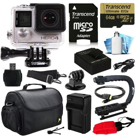 GoPro Hero 4 HERO4 Silver Edition 4K Action Camera Camcorder with 64GB MicroSD Card, Battery, Charger, Large Case, Stabilizer Handle Grip, HDMI, MicroSD Reader, Dust Cleaning Care Kit