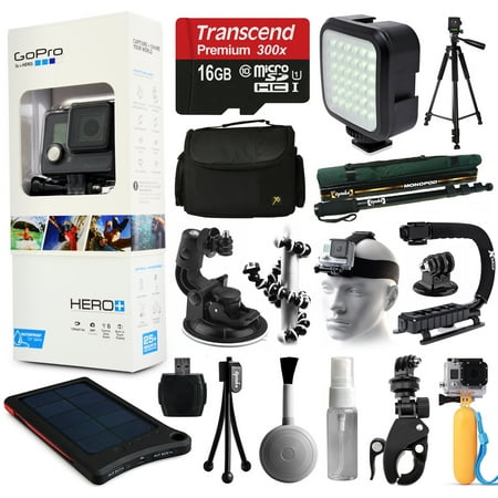 GoPro HERO+ Camera Camcorder (CHDHC-101) with Extreme Accessories Bundle includes 16GB Card + Opteka X-Grip + LED Light + Case + Tripod + Selfie Stick + Car\/Bike Mount + Solar Charger + More