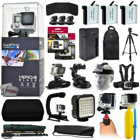 In the box:- GoPro HERO4 Black- Rechargeable Battery for HERO4- Standard Housing- Skeleton Backdoor- Curved Adhesive Mount- Flat Adhesive Mount- Quick Release Buckle- 3-Way Pivot Arm- USB Cable47th Street Photo Accessories:- Two 32GB Transcend Class 10 microSD Cards (633x) - Replacement Li-ion Battery Pack for GoPro (3) - Replacement AC\/DC Charger with Car Plug- Weather and Stain Resistant Travel Backpack- Pro Series 60 Inch Tripod Full Size Tripod- Hand Glove Wrist Strap- Car Suction Cup Mount- Head\/Helmet Strap Mount- Chest Mount- Opteka MP100 67\